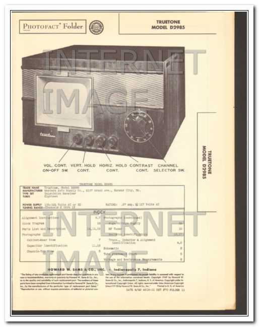 Vintage TRUETONE model D2985 18 tube TV television receiver. Original old Sams Photofact manual includes schematic, layout, voltage & resistance test charts, repair parts list. 20 pages. Dated 1949. Western Auto Supply Company of Kansas City, KS. This manual would make a sensational accompaniment to your vintage video television equipment.