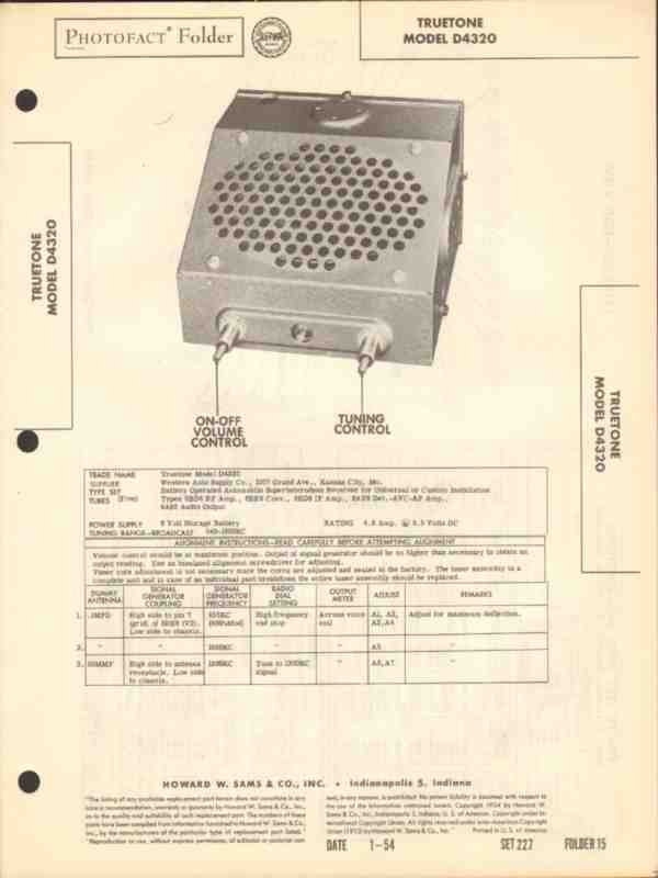 Vintage TRUETONE model D4320 5 tube Superheterodyne AM car radio receiver. Original old Sams Photofact manual includes schematic, layout, alignment instructions, voltage & resistance test chart, repair parts list. 4 pages. Dated 1954. Western Auto Supply Company of Kansas City, MO.