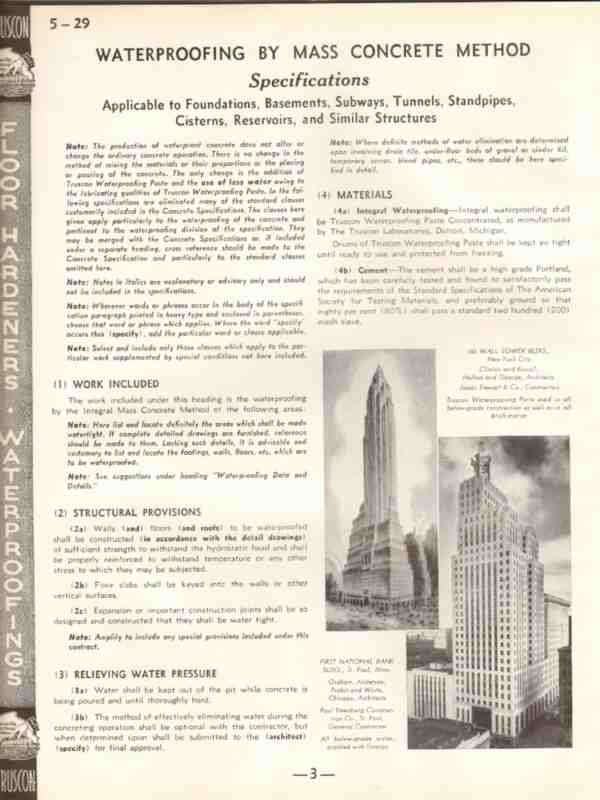 Original concrete trade vintage catalog for THE TRUSSED CONCRETE & STEEL COMPANY, and TRUSCON LABORATORIES of Detroit, MI. Manufacturers of Waterproofings, Dampproofings, Floor Treatments, Caulking by Truscon. You Can Dip this House in Water. An institution founded on the idea of better concrete construction. Reference Chart provided. Disbound from a large 1938 construction materials book, this unique eleven page technical specifications brochure would make a sensational addition to your retro architectural and engineering library. Pages are loose and contains a small amount of residual glue on edge.