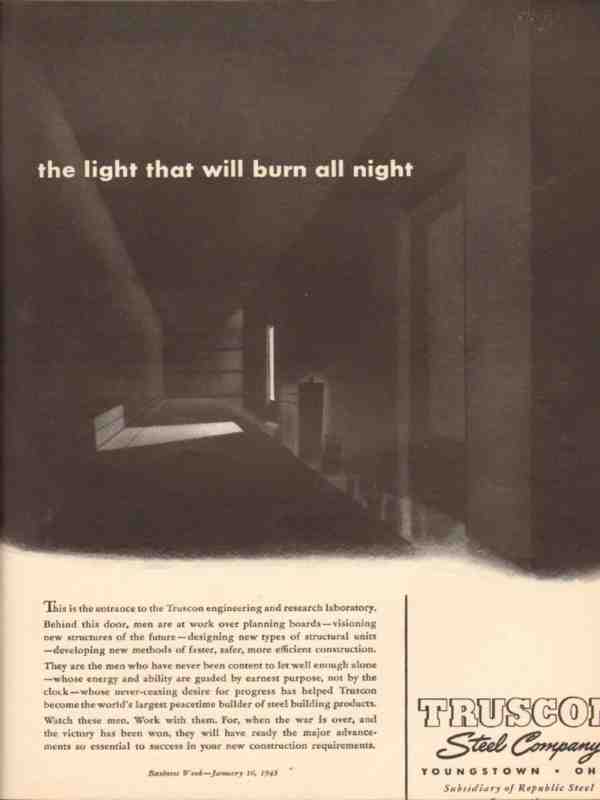 Original World War 2 business industry trade magazine vintage ad for TRUSCON STEEL COMPANY of Youngstown, OH. The Light That Will Burn All Night. Truscon engineering and research laboratory. Old 1943 WW2 wartime era propaganda magazine advertisement.