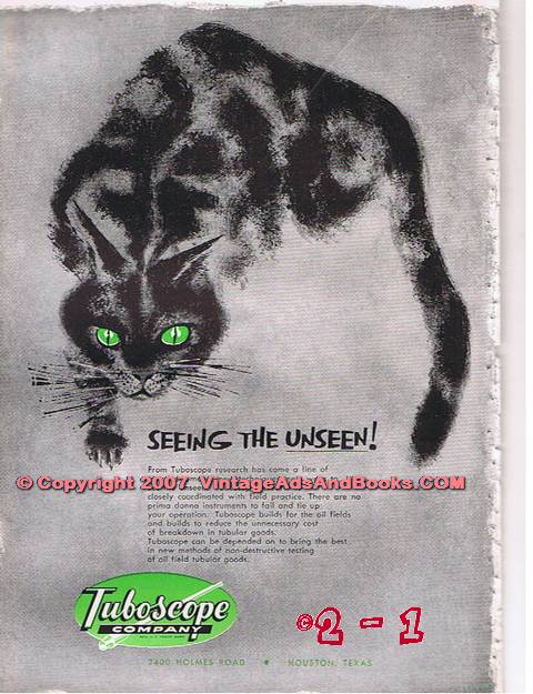 Original oil and gas trade magazine vintage ad for TUBOSCOPE COMPANY, was located at 2400 Holmes Road, Houston, TX. Seeing The Unseen! Black cat with bright green eyes. This unique 1955 old petroleum oilfield drill pipe and pipeline industry equipment magazine advertisement would look sensational when matted and framed! Awesome graphics. Approximate size 9 x 12 inches.