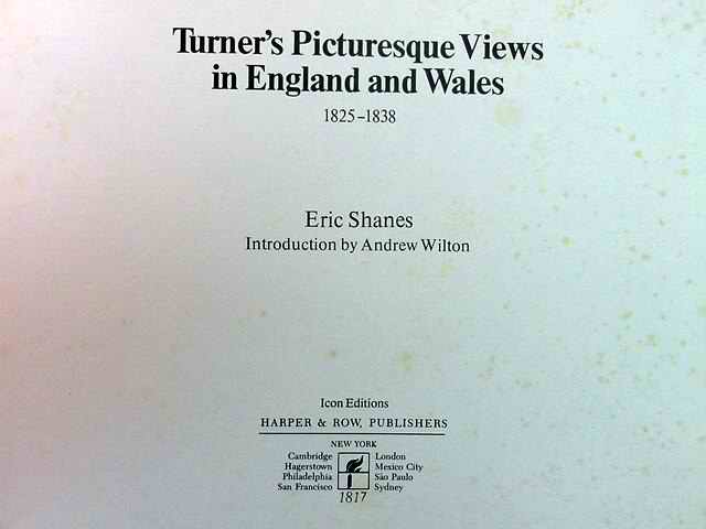 Hard covered book titled TURNER'S PICTURESQUE VIEWS IN ENGLAND AND WALES 1825 - 1838 by Eric Shanes, Introduction by Andrew Wilton, 1979, 1st U.S. Edition. This book brings together as many of the watercolors by J.M.W. Turner RA as can be traced, to where they remain untraced, to reproduce the engravings. Filled with color and black & white plates. Book is in VG condition. Pages are clean and intact, and the binding is tight. The cover is slightly bowed due to improper storage at some point. The outer page edges have a small amount of foxing. This beautifully illustrated book would make an excellent addition to any library!