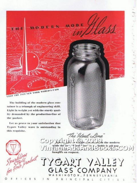 Original vintage magazine ad, TYGART VALLEY GLASS COMPANY of Washington, PA. The Ideal Line, The Modern Mode in Glass. Visit the 1939 New York World's Fair. Old 1938 glass industry advertisement. This ad features a vivid red background. Please see (Related Products tab) item p764 to view the same ad with a bright blue background! Both would look fantastic matted and framed.