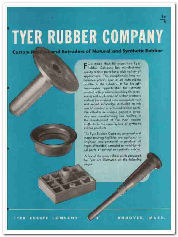 Manufacturers of Custom Molders and Extruders of Natural and Synthetic Rubber. Tyler designs and molds quality rubber parts for many industries, including Agricultural Machinery, Dairy, Home Appliances, Electrical, Optical, Shoe Machinery, Electronics, Automotive, Plastics, Miscellaneous Machinery Parts, Rubber Roll Covering, Shock Mounts, Inks and Adhesives. Unbound from a large wartime 1945 engineering design catalog, this unique old four page technical brochure would display beautifully matted and framed. Great cover graphics. A fantastic addition to your retro rubber library.