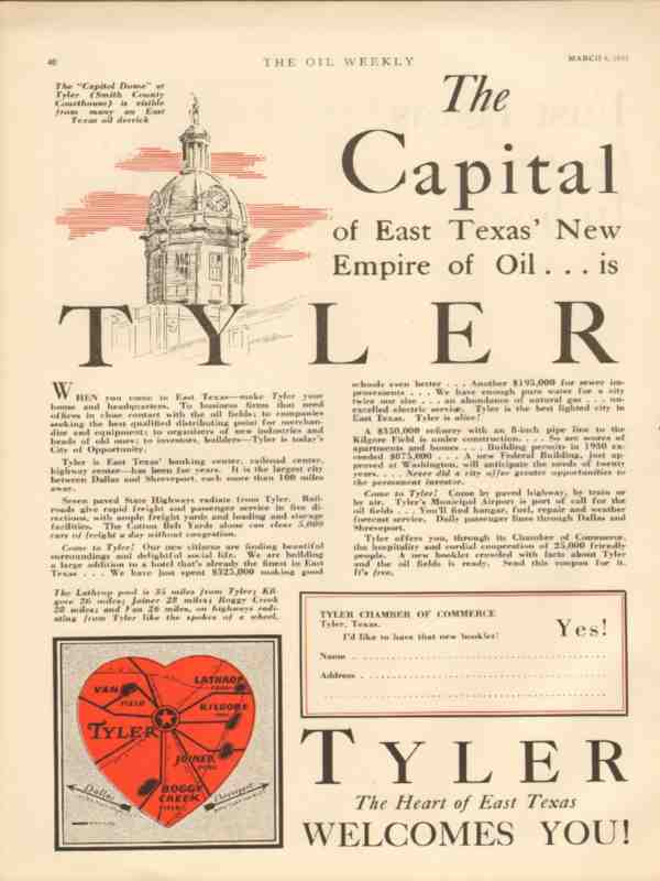 Original oil and gas trade magazine vintage ad for TYLER, TEXAS Chamber of Commerce. The Capital of East Texas' New Empire of Oil is Tyler. Van Field, Lathrop Pool, Kilgore Pool, Joiner Pool, Boggy Creek Field nearby. This unique 1931 old oilfield petroleum drilling industry and real estate magazine advertisement would display beautifully matted and framed.
