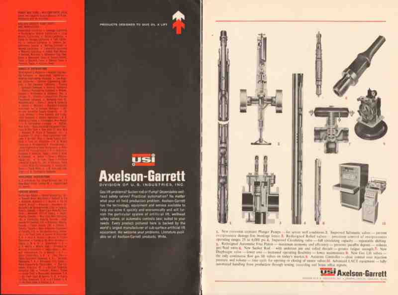 Original oil and gas trade magazine vintage ad for U.S. INDUSTRIES INC. Gas lift problems? Sucker rod or pumps? Dependable wellhead safety valves? No matter what your oil field production problem Axelson-Garrett has the technology, equipment and service to help you solve it quickly and economically. This unique 1962 old two-page gatefold petroleum oilfield industry equipment magazine advertisement would display beautifully matted and framed.