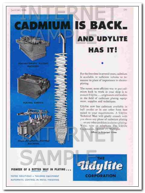 Original vintage industrial magazine ad, for UDYLITE CORPORATION of Detroit, MI. Cadmium Is Back And Udylite Has It! Semi-Automatic Plating Machines, Plating Barrels, Fully Automatic Plating Machines. Old dated 1948 industry advertisement. (The scan shows a slight pink tint that is not on the actual ad.)