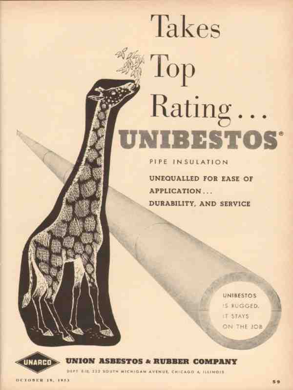 Original oil and gas trade magazine vintage ad for UNION ASBESTOS & RUBBER COMPANY, was located at 333 South Michigan Avenue, Chicago, IL. Takes Top Rating, Unibestos Pipe Insulation. UNARCO. This unique 1953 old petroleum oilfield pipeline equipment industry magazine advertisement would display beautifully matted and framed.