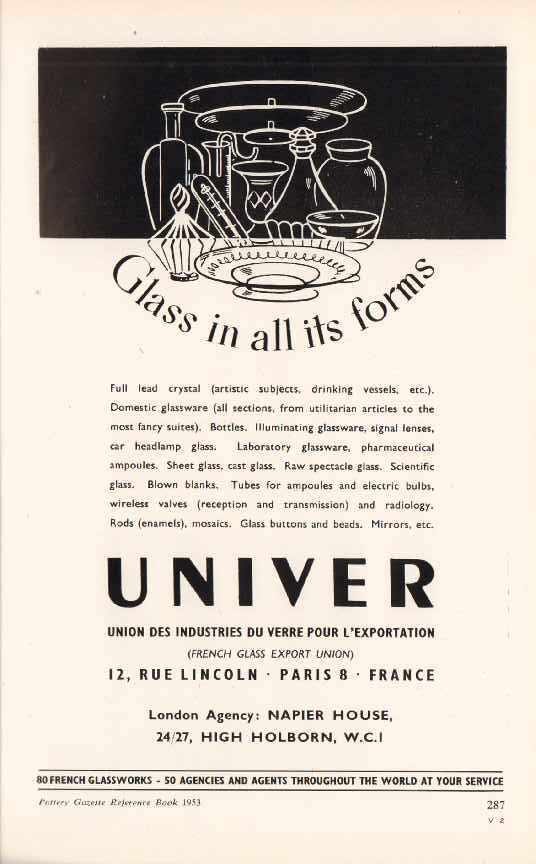 Original glass vintage ad for UNION INDUSTRIES VERRE POUR LEXPORTATION. French Glass in all its forms. Full lead crystal, domestic glassware, bottles, illuminating glassware, signal lenses, car headlamp glass, laboratory glass, pharmaceutical ampoules, sheet glass, cast glass, spectacle, scientific, blown blanks, tubes for electric bulbs, wireless valves and radiology, rods, mosaics, glass buttons and beads, mirrors.