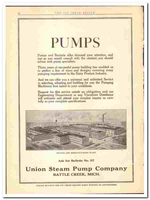 Original 1919 ice cream trade vintage magazine ad for the UNION STEAM PUMP COMPANY. Main office and plant were located in Battle Creek, MI.