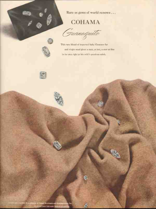 Original old trade magazine ad for UNITED MERCHANTS AND MANUFACTURERS, INC. Rare as gems of world renown, Cohama Guanaquito. This rare blend of imported baby Guanaco fur and virgin wool gives a man, at last, a coat as fine in its own right as his wife's precious mink. Diamonds from The Harry Winston Collection. This 1947 Cohama Fabrics magazine advertisement would display beautifully matted and framed.