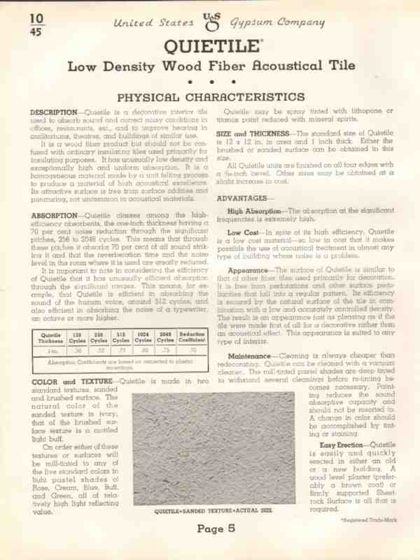 Original insulation trade vintage catalog for UNITED STATES GYPSUM COMPANY, main office was located in Chicago, IL. The Red Book. USG Building Materials. Manufacturers of Sound Control. Acoustone Acoustical Tile, Perfatile Quietile, Sabinite Acoustical Plaster, Fireproof Wall & Ceiling Constructions, Trembar Resilient Machinery Mountings. Descriptions and Specifications in detail. Unbound from a large 1938 architectural catalog, this unique old thirteen page technical brochure would exhibit beautifully matted and framed. A fantastic dated addition to your retro insulation collection. Pages are detached and may contain a small amount of residual glue on edge.