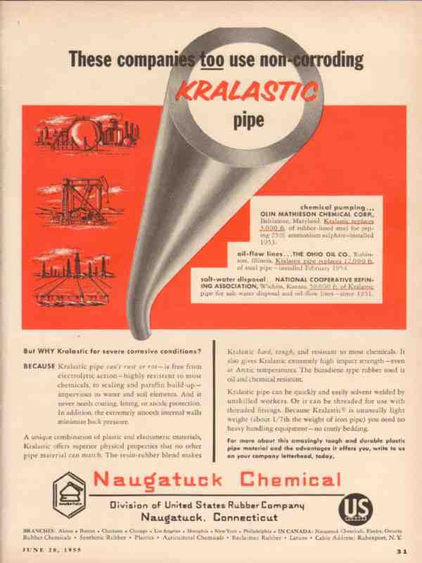 Original old petroleum trade magazine vintage ad for UNITED STATES RUBBER COMPANY of Naugatuck, CT. Kralastic Non-Corroding Pipe used by Olin Mathieson Chemical Corporation, Ohio Oil Company, National cooperative refining Association. This unique 1955 oil and gas industry advertisement would display beautifully matted and framed.