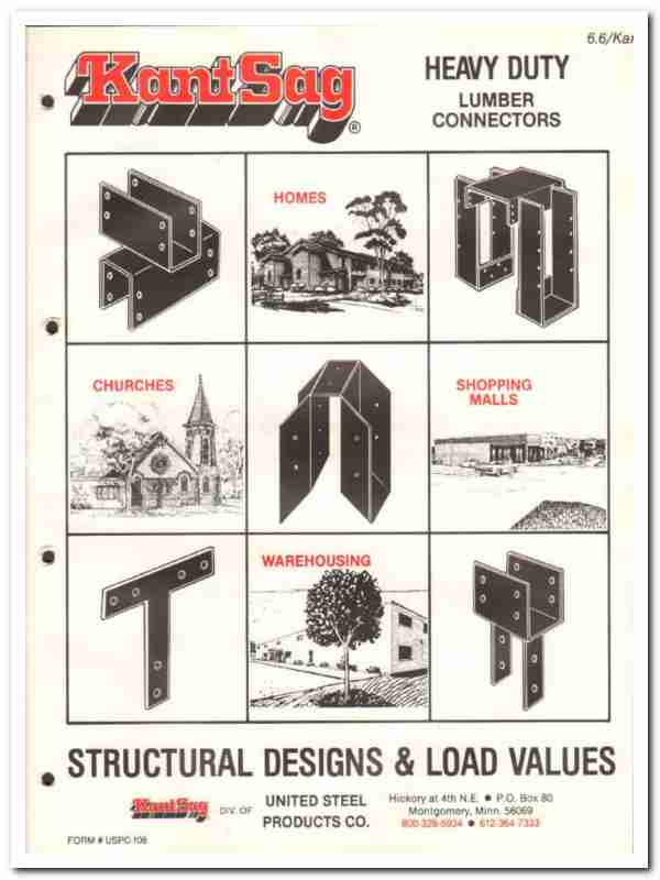 Original hardware trade vintage catalog for UNITED STEEL PRODUCTS COMPANY.  Main office was located at Hickory and 4th NE, Montgomery, MN.  Manufacturers of Kant Sag heavy duty lumber connectors for homes, churches, shopping malls and warehousing. Structural Designs and Load Values. Joist supports, joist hangers, purlin hanger, column caps, post beam cap, column bases, elevated post bases, post anchors, rafter-hurricane ties, truss anchors, plate straps, wall bracing, anchor downs, angle gusset, z-clips and more are discussed in detail. Disbound from a large 1982 home builders hardware catalog, this unique old twenty-four page technical specifications brochure would display wonderfully matted and framed. Nice cover graphics. A marvelous addition to your retro hardware library. Pages are detached and may contain a small amount of residual glue on edge. Form USPC-108.