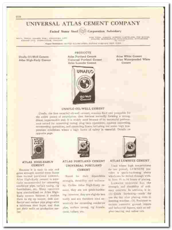 Products include UNAFLOW Oil-Well Cement, which is fully featured. Also featured is the Alas High-Early Cement, Atlas Portland Cement, Universal Portland Cement and Atlas Lumnite Cement.