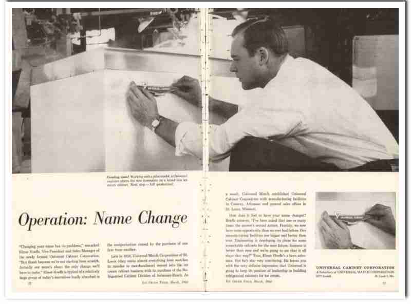 Original ice cream trade magazine vintage ad for UNIVERSAL CABINET CORPORATION. Main office and factory was located at 3377 Lindell Boulevard, St. Louis, MO. Pictured is Mr Elmer Hoefle, VP and Sales Manager. He said changing your name has its problems but thank heavens we are not starting from scratch. Late in 1959, the Universal Match Corporation of St. Louis, MO, moved into the ice cream cabinet business with its purchase of the Refrigerated Cabinet Division of Anheuser-Busch. As a result, Universal Match established Universal Cabinet Corporation, with manufacturing facilities in Conway, AR, and the general sales offices in St Louis, MO. This unique 1960 old two-page gatefold dairy industry magazine advertisement would display wonderful matted and framed. Nice graphics.
