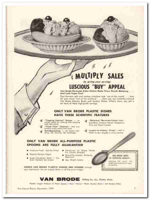 Original ice cream trade magazine vintage ad for VAN BRODE MILLING COMPANY, INC. Main office and plant was located in Clinton, MA. Manufacturers of plastic dishes and spoons. Buy Appeal dishes with topping control design, fluid flow channel, self separating and delicious Bermuda colors. Order plastic dishes and spoons through your distributor. This unique 1959 old dairy industry magazine advertisement would display wonderful matted and framed. Nice graphics.
