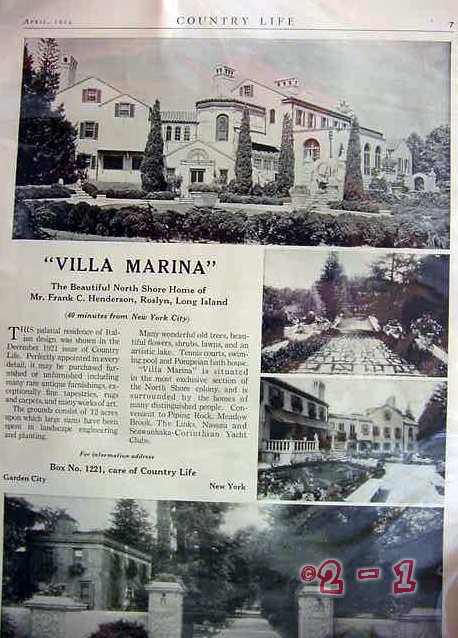 Original vintage magazine ad, Features the VILLA MARINA the Beautiful North Shore Home of Mr. Frank C. Henderson of Roslyn, Long Island, Nassau County, New York. Estate is said to be convenient to Piping Rock Country Club, Meadow Brook Country Club, The Links, Nassau and Seawanhaka - Corinthian Yacht Clubs. Old 1924 dated Villa Marina Long Island New York real estate advertisement,