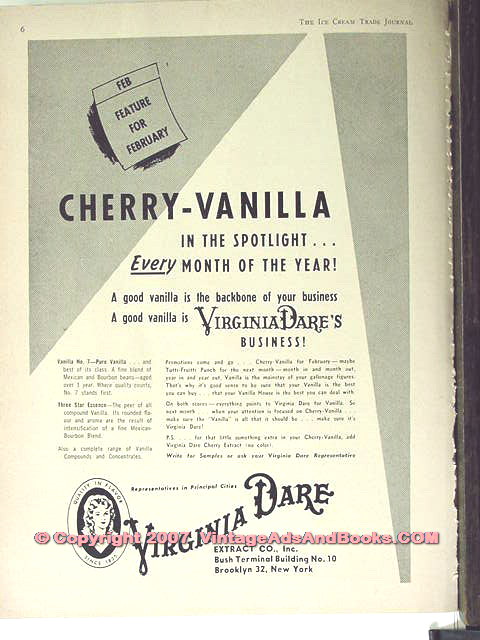 Original ice cream trade magazine vintage ad for VIRGINIA DARE EXTRACT COMPANY, INC. Main office and plant was located at Bush Terminal Building No. 10, Brooklyn, New York City. Manufacturers of Cherry Vanilla, Vanilla No. 7 - Pure Vanilla flavors. This unique 1951 old dairy industry magazine advertisement would display wonderful matted and framed. Nice graphics. Approximate size 8.5 x 11 inches.
