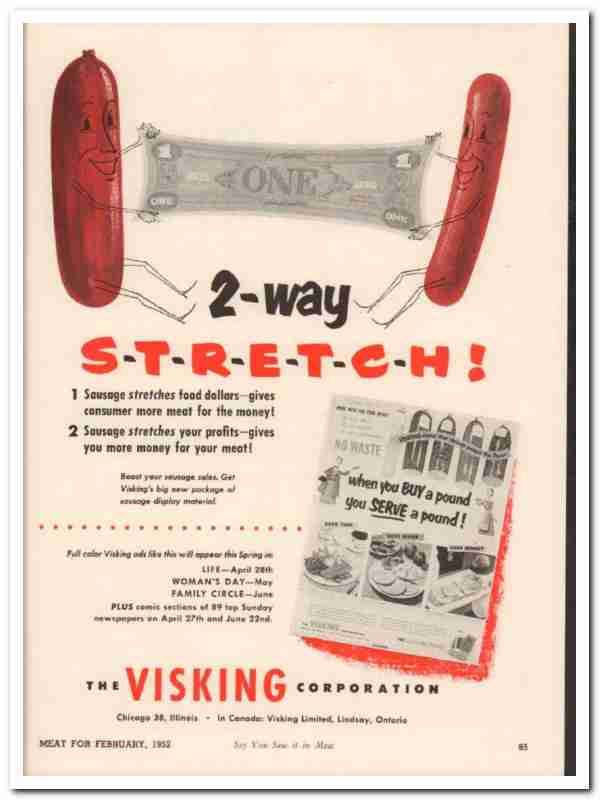 Original 1952 meat packing trade magazine vintage ad for THE VISKING CORPORATION. Main office and plant was located in Chicago, IL. 2-Way S-T-R-E-T-C-H! Sausage stretches food dollars and profits. This old one page magazine advertisement would display beautifully matted and framed.