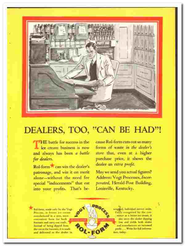 'Rol-form, made only by Vogt Process, is better ice cream manufactured in a new, more convenient form for both fountain and carry-out trade. Instead of being dipped from the can at the fountain, it is made and delivered to the dealer in wrapped, individual-service units. Easily recognized by the consumer as a better ice cream, it also saves the dealer dipping loss and yields both dealer and manufacturer an increased profit'.