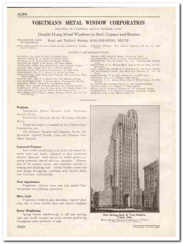 Original window trade vintage catalog for VOIGTMANN METAL WINDOW CORPORATION. (Division of Campbell Metal Window Corporation) Main office and factory was located at Reed and Fulford Streets, Kalamazoo, MI. Manufacturers of Double Hung Windows. Available in steel, copper and bronze. New double weathering at all points of contact between sash and frame, adjusted to give maximum weather tightness. Installed at the Ohio Savings Bank & Trust Building in Toledo, OH. Mills, Rhines, Bellman & Nordhoff, Architects. Unbound from a large 1931 architectural catalog, this unique old two page technical brochure would display wonderful matted and framed. Nice graphics. A fabulous addition to your retro window weatherstrip library. Pages are detached and may contain a small amount of residual glue on edge.