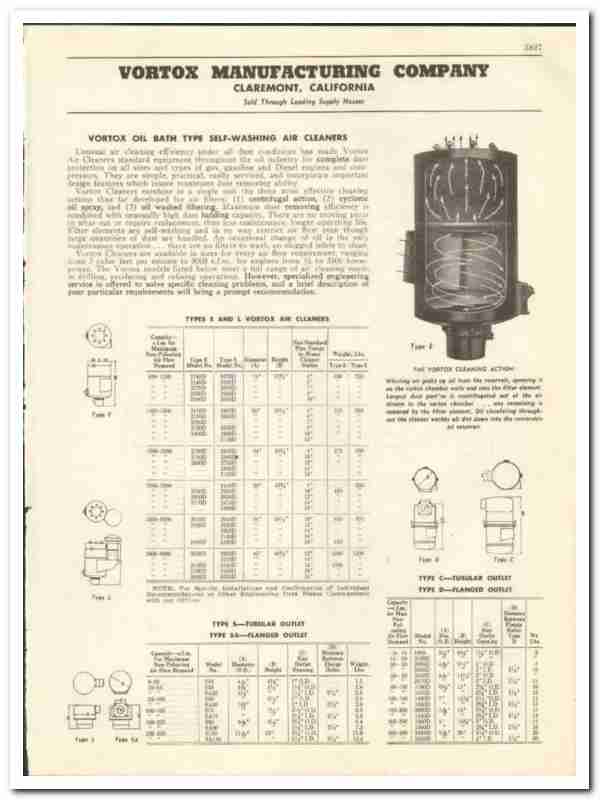Products include Vortox Oil Bath Type Self-Washing Air Cleaners. Universal air cleaning efficiency under all dust conditions has made Vortox Air Cleaners standard equipment throughout the oil industry for complete dust protection on all sizes and types of gas, gasoline and Diesel engines and compressors. They are simple, practical, easily serviced and incorporate important design features which insure maximum dust removing ability.
