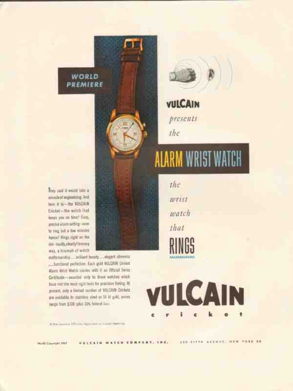 Original old trade magazine ad for VULCAIN WATCH COMPANY, INC of New York City, NY. World Premiere of the Vulcain Cricket, The Alarm Wrist Watch that Rings. This 1947 watch magazine advertisement would display beautifully matted and framed.