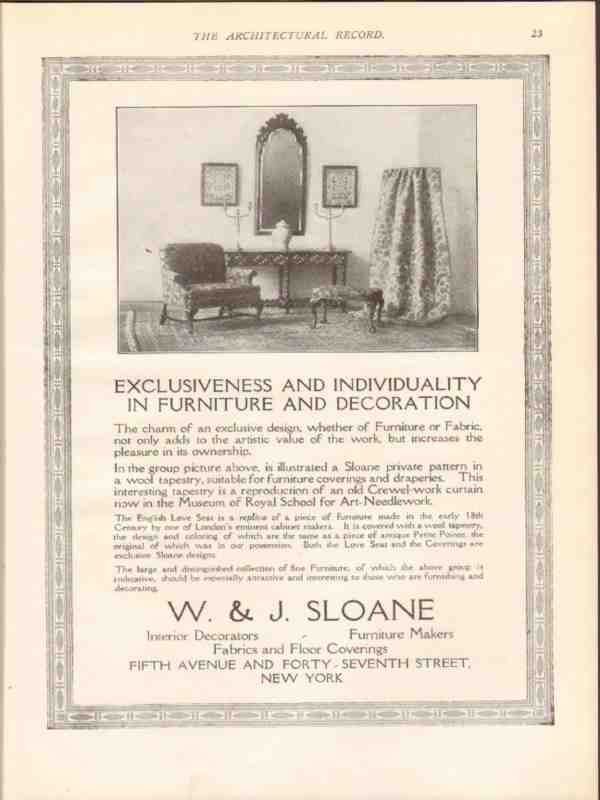 Original vintage architectural trade magazine ad for W. & J. SLOANE of New York City, NY. Exclusiveness and Individuality in Furniture and Decoration. Sloane private pattern in a wool tapestry is shown. Old 1913 interior design, antique fabrics advertisement.