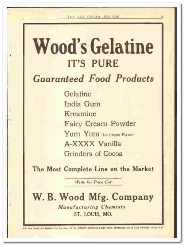 W B Wood Mfg Company 1921 vintage ice cream ad Gelatine pure