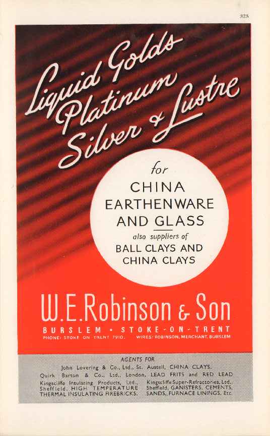 Original pottery vintage ad for W. E. ROBINSON AND SON. Liquid Golds, Platinum, Silver and Lustre for China, Earthenware and Glass. Also suppliers of Balls and China Clays. Agents for John Lovering and Company, Quirk Barton and Co., Kingscliffe Insulating Products.