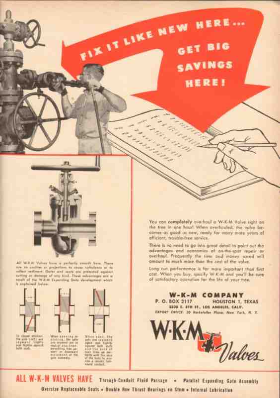 Original oil and gas trade magazine vintage ad for W-K-M COMPANY, INC, of Houston, TX. Fix it Like New, completely overhaul valves right on the tree in one hour! All have a perfectly smooth bore. Gates and seats are protected against cutting or damage of any kind. This unique 1953 old oilfield petroleum well industry equipment magazine advertisement would display beautifully matted and framed.