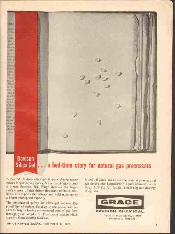 Original oil and gas trade magazine vintage ad for W. R. GRACE COMPANY of Baltimore, MD. Davison Chemical. Davison Silica Gel, a Bed Time Story for Natural Gas Processors. Cut the costs of your natural gas drying and hydrocarbon liquid recovery. This unique 1962 old petroleum and petrochemical refining process industry magazine advertisement would display beautifully matted and framed.