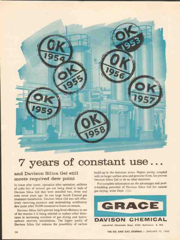 Original oil and gas trade magazine vintage ad for W. R. GRACE COMPANY of Baltimore, MD. Davison Chemical. 7 Years of Constant Use and Davison Silica Gel Still Meets Required Dew Point. This unique 1962 old petroleum petrochemical refining magazine advertisement would display beautifully matted and framed.