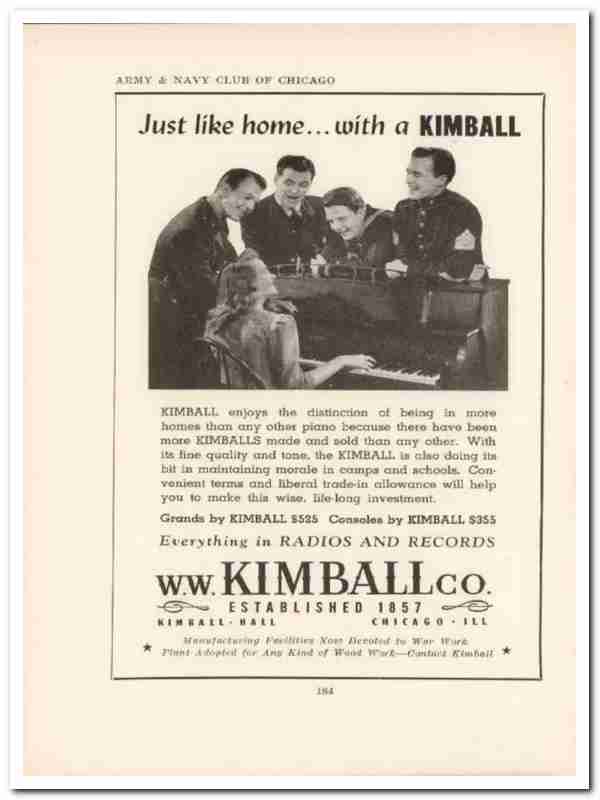 Original WW2 wartime vintage ad for W. W. KIMBALL COMPANY. Just Like Home with Kimball piano. Also doing its bit in maintaining morale in camps and schools. Grands for 525 dollars. Everything in radios and records.