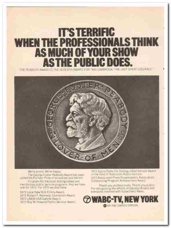 Original media vintage magazine ad for WABC-TV Terrific George Foster Peabody Award for the most distinguished and meritorious public service programs. Thank you for recognizing the efforts of Geraldo Rivera and everyone involved with Eyewitness News. Expose on Willowbrook State Hospital, The Last Great Disgrace.