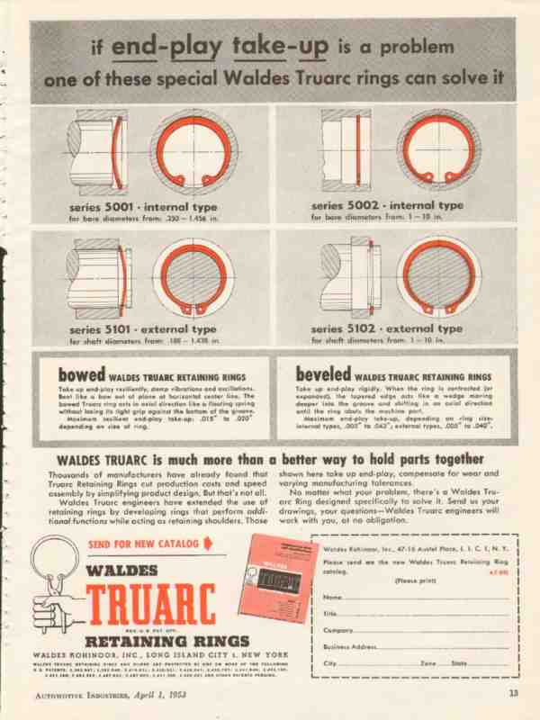 waldes kohinoor inc 1953 end play take up truarc rings vintage ad