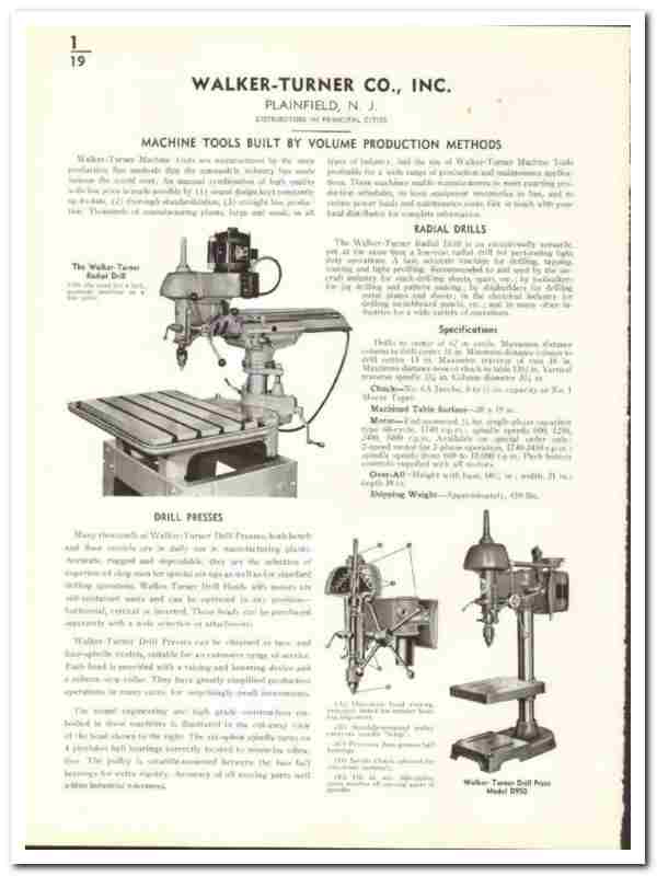 Walker Turner Machine Tools are manufactured by the same production line methods that the automobile industry has made famous the world over. Unusual combination of high quality with low price is made possible by (1) sound design constantly up-to-date, (2) thorough standardization, (3) straight line production. Thousands of manufacturing plants, large and small, and all types of industry, find the use of the Walker Turner Machine Tools profitable for a wide range of production and maintenance applications. These machines enable manufacturers to meet exacting production schedules, to keep equipment inventories in line, and to reduce power loads and maintenance costs.