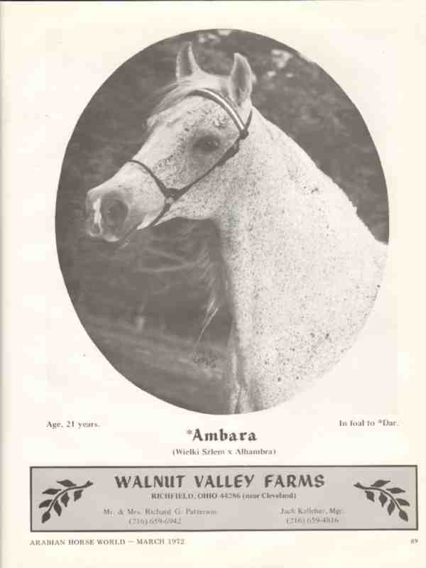 Original old equestrian trade magazine vintage ad for WALNUT VALLEY FARMS horse ranch in Richfield, OH. Ambara, sire Wielki Szlem and dam Alhambra, is pictured. Aged 21, in foal to Dar. Owners Mr and Mrs Richard G. Patterson, Jack Kellcher, manager. Photograph by Polly Knoll. This unique 1972 Arabian equine advertisement would display beautifully matted and framed.
