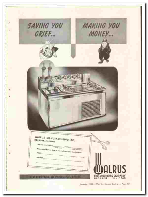 Original 1948 ice cream vintage magazine ad for the WALRUS MANUFACTURING COMPANY. Main office and plant were located in Decatur, IL.