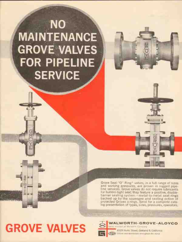 Original oil and gas trade magazine vintage ad for WALWORTH-GROVE-ALOYCO of Oakland, CA. No Maintenance Grove Valves for Pipeline Service. Grove Seal O Rings Valves. This unique 1962 old oilfield petroleum well and pipeline equipment industry magazine advertisement would display beautifully matted and framed.