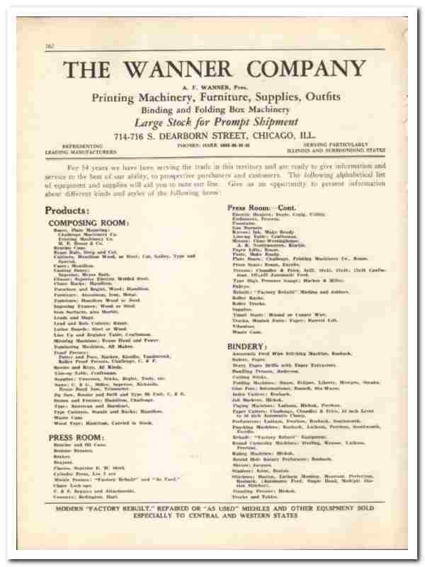 Original 1930 industrial printing trade vintage catalog for the WANNER COMPANY. Main office and plant was located at 714-716 South Dearborn Street, Chicago, IL. (A. F. Wanner, President).