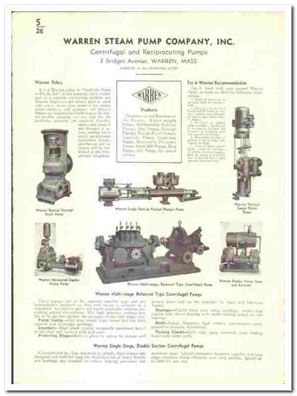 Products include Warren Multi-Stage Balanced Type Centrifugal Pumps, Warren Single-Stage Double Suction Centrifugal Pumps, Warren Single-Stage Centrifugal Stock Pumps, Warren Liquid Pumps, Warren Steam Heat Vacuum Pumps, Warring Horizontal Single Piston Pumps, Warren Vertical Single Piston Pumps, Warren Horizontal 'RealWear' Duplex Piston Pumps, Warren Vertical Duplex Piston Pumps, Warren Duplex Automatic Piston Pumps & Receivers and the Warren Duplex Outside Packed Plunger Pumps, all are fully featured.