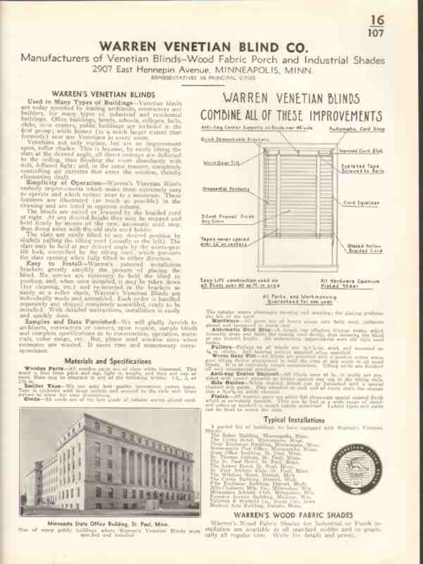 Original window trade vintage catalog for WARREN VENETIAN BLIND COMPANY. Main office and factory was located at 2907 East Hennepin Avenue, Minneapolis, MN. Manufacturers of Venetian Blinds, Wood Fabric Porch and Industrial Shades. Specified by leading architects, contractors and builders for industrial and industrial buildings. Unbound from a large 1938 architectural catalog, this unique old one page technical brochure would display wonderful matted and framed. Nice graphics. A fabulous addition to your retro window shades library.