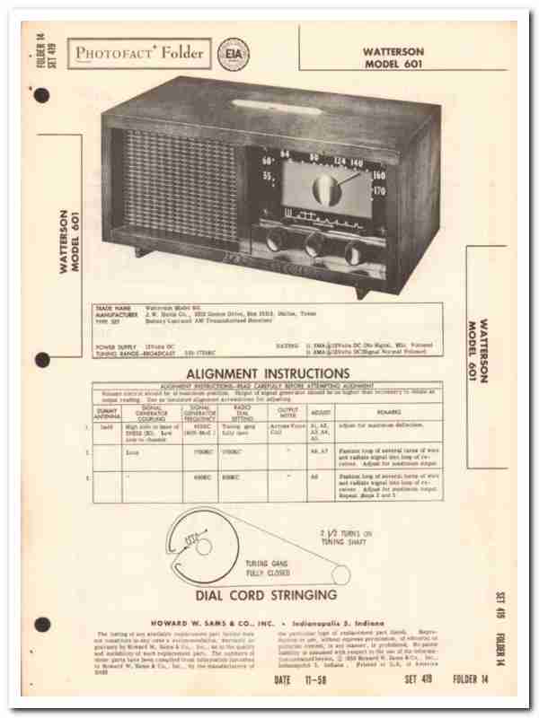 Vintage WATTERSON model 601 battery operated AM transistor radio receiver. Original old Sams Photofact manual includes schematic, parts layout, alignment instructions, dial cord stringing, voltage & resistance test chart, repair parts list and description. 4 pages. Dated 11-1958. Manufactured by J.W. Davis Company, of Dallas, TX. This manual would make a sensational accompaniment to your retro audio equipment.