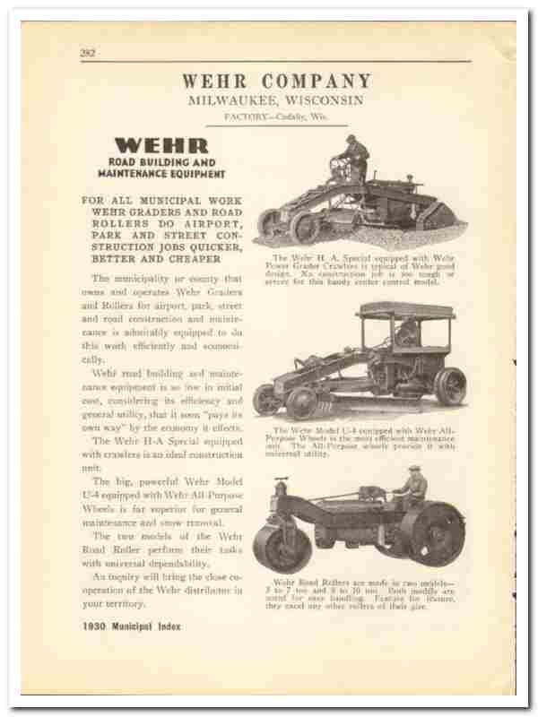 For all municipal work, Wehr Graders and Road Rollers do airport, park and street construction jobs quicker, better and cheaper. The municipality or county that owns and operates Wehr Graders and Rollers for airport, park, street and road construction & maintenance is admirably equipped to do this work efficiently and economically. Wehr road building and maintenance equipment is so low and initial cost, considering its efficiency and general utility, that it soon pays for itself own way by the economy and effects.