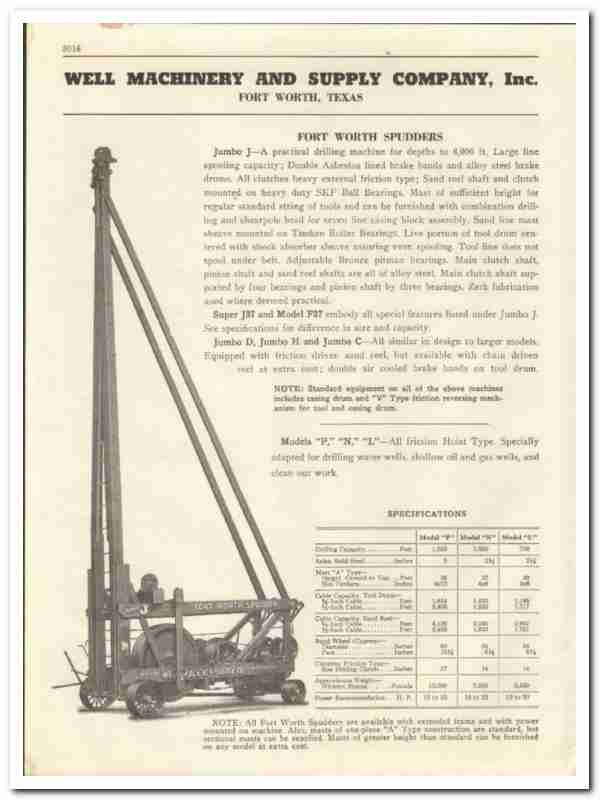 Products include Fort Worth Spudders. The Jumbo J is a practical drilling machine for depths to 6000 feet. Large line spooling capacity, double asbestos lined brake bands and alloy steel brake drums. All Clutches heavy external friction type, sand reel shaft and clutch mounted on heavy duty SKF Ball Bearings.