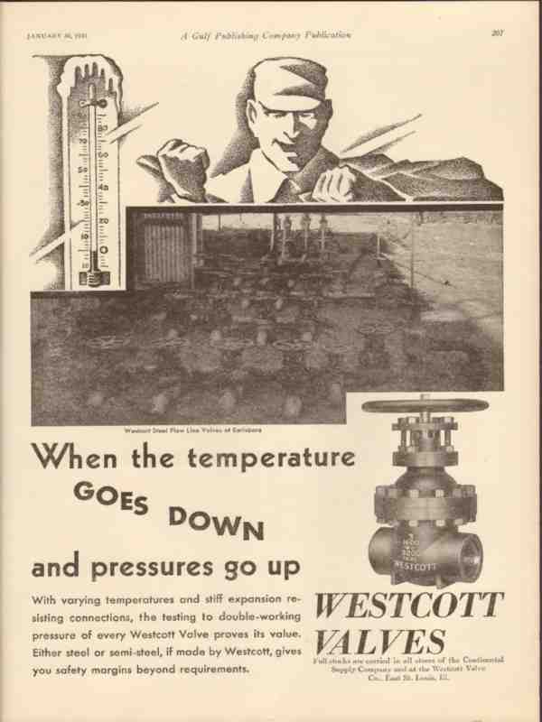 Original oil and gas trade magazine vintage ad for WESTCOTT VALVE COMPANY of East St. Louis, IL. When the Temperature Goes Down and Pressures Go Up, Westcott Valves. This unique 1931 old oilfield petroleum wellhead industry equipment magazine advertisement would display beautifully matted and framed.