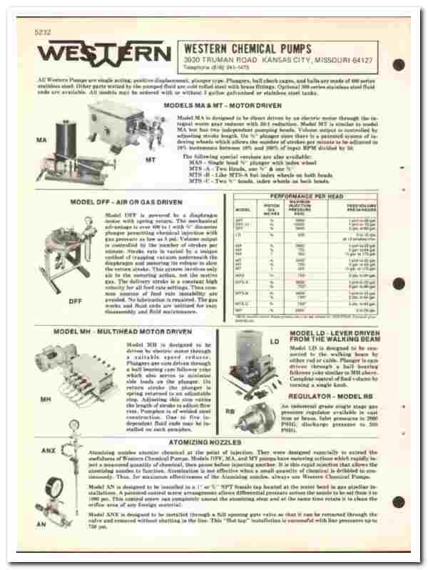 Original 1974 Oil and Gas trade vintage catalog for WESTERN CHEMICAL PUMPS, INC. Main office and plant were located at 3930 Truman Road, Kansas City, MO.