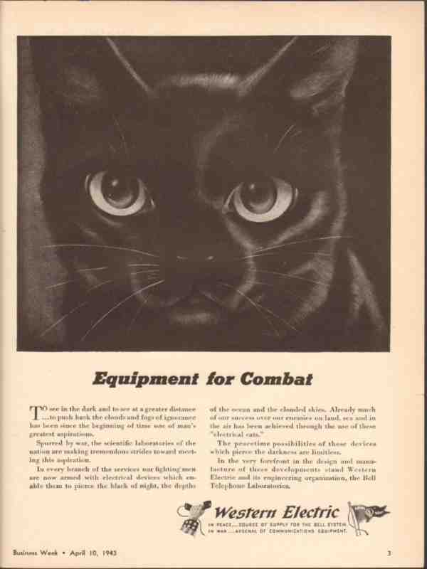 Original World War 2 Bell Telephone System industry trade magazine vintage ad for WESTERN ELECTRIC. Equipment for Combat. In every branch of the services our fighting men are now armed with electrical devices which enable them to pierce the black of night, the depths of the ocean and the clouded skies. Electrical cats. Old 1943 WW2 wartime era propaganda magazine advertisement.